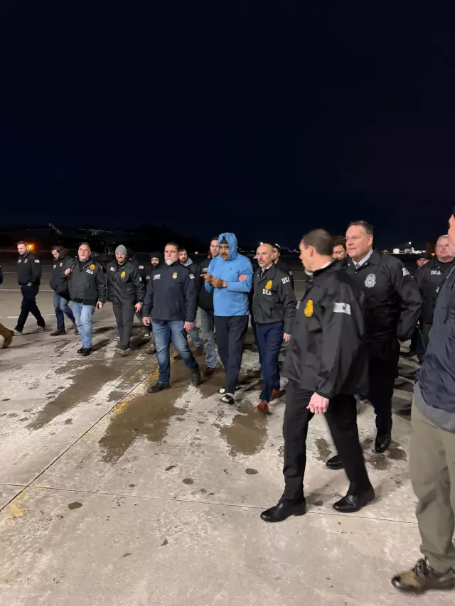 Venezuela Devlet Başkanı Nicolas Maduro ve eşi Cilia Flores, New York’un kuzeyinde bulunan Stewart Hava Ulusal Muhafız Üssü’ne getirildi. Maduro’nun üzerindeki mavi sweatshirt ve alınan geniş güvenlik önlemleri dikkatlerden kaçmadı. Hakkında yeni iddianame hazırlanan Maduro’nun “uyuşturucu terörizmi” suçlamasıyla kokain ithali için komplo kurmakla suçlandığı, ayrıca iddianamede ağır silah ve tahrip edici cihazlar bulundurmaya yönelik iddiaların yer aldığı kaydedildi.