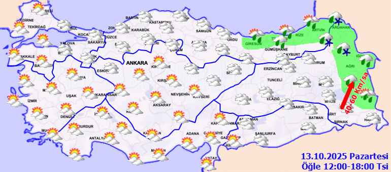 Meteoroloji Genel Müdürlüğü tarafından yapılan tahminlere göre, ülkemiz genelinin parçalı ve çok bulutlu, Marmara’nın doğusu, Karadeniz, Doğu ve Güneydoğu Anadolu ile Sivas’ın doğusu, Osmaniye ve Kahramanmaraş çevrelerinin yağışlı geçeceği tahmin ediliyor. Genellikle yağmur ve sağanak, Doğu Karadeniz’in iç kesimlerinin yüksekleri ile Doğu Anadolu’nun kuzey ve doğusunun yüksek kesimlerinde karla karışık yağmur ve yer yer kar şeklinde görülmesi beklenen yağışların; Doğu Anadolu, Güneydoğu Anadolu’nun doğusu, Rize, Artvin çevreleri ile bu akşam saatlerinde Sinop çevreleri ve Kastamonu’nun kuzey ilçelerinde yerel kuvvetli olması bekleniyor. Rüzgar, Güney Ege, Akdeniz’in iç kesimleri, İç Anadolu’nun güneyi ve Orta Karadeniz kıyılarında kuzeyli yönlerden, Doğu Anadolu’da güneyli yönlerden kuvvetli olarak (40-60 km/saat) esmesi tahmin ediliyor.